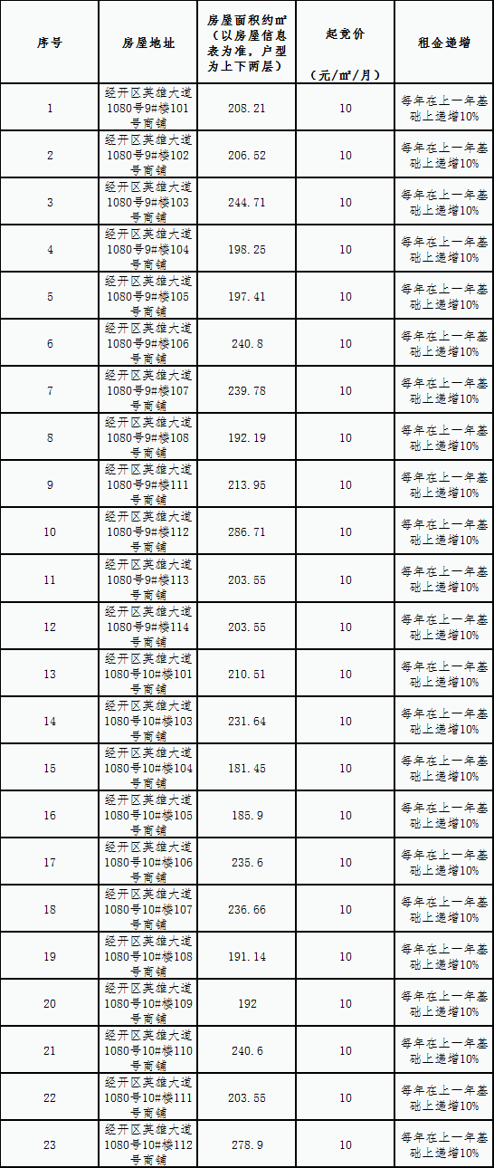 二、本次竞拍采用有底价、有声竞拍的形式。竞拍开始后,首次叫价为增幅后报价,不低于10.5元/平方米/月,每次报价增幅最低不低于0.5元/平方米/月的整倍数,如出现竞拍人仅举牌不叫价情况,即默认为在上一轮叫价基础上增加0.5元/平方米/月,否则应价无效。当最高价(超过底价)未有人追加竞价时,主拍人对该价重复三次报价,第三次重复报价无人应价,由主拍人宣布成交。本次竞拍取达到底价的最高报价人作为中标人,中标人若放弃中标人权力,不按排名顺延中标人,我司将做废标处理。