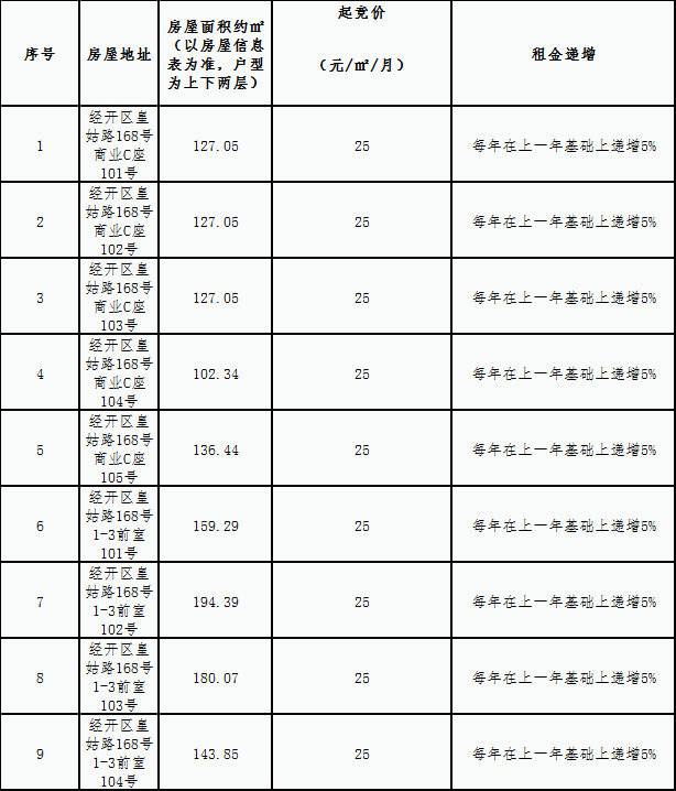 三、本次竞拍每间商铺租金起竞价如下: