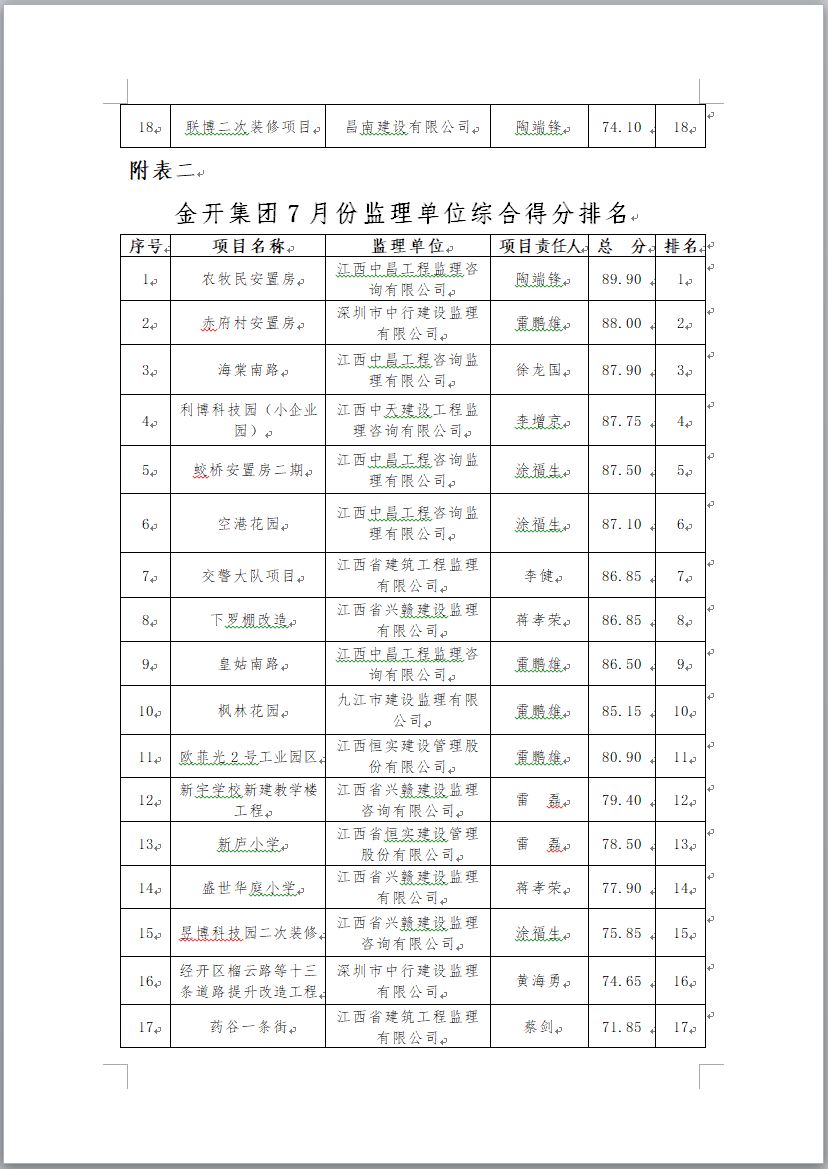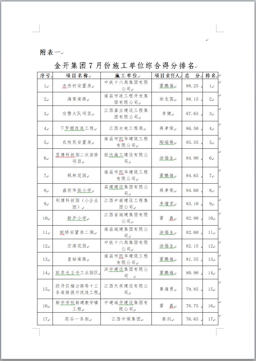 金开集团在建项目2017年7月施工、监理单位考核排名通报